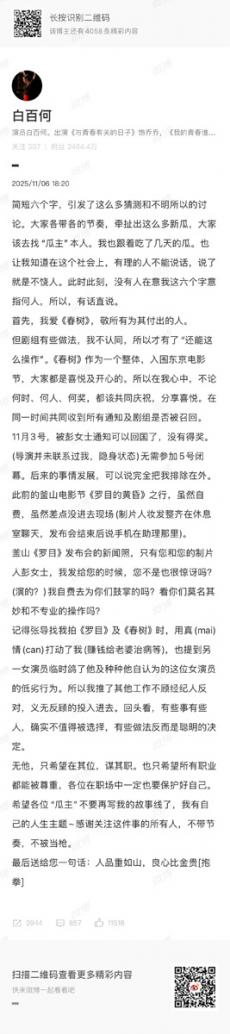 亚洲明星网www asiacool com 人品重如山,良心比金贵。11月6日,演员白百何在社交平台发布长文,回应近日围绕东京电影节的争议,直言不讳地批评《春树》剧组的做法。 这场风波的起点是11月3日她发出的那