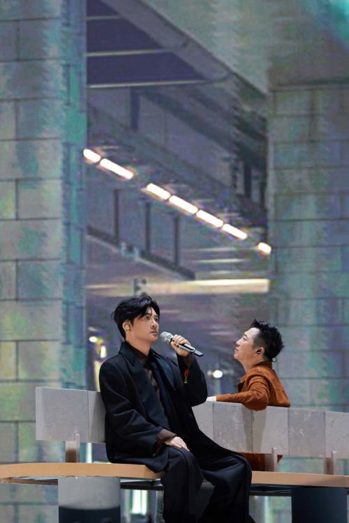 本期节目以组合竞演的形式展开。在歌曲讨论阶段,苏有朋展现出“人间清醒”的音乐态度,他并未选择互唱代表作的稳妥路线,而是希望开拓新的表达。他说:“我通常会觉着,如果太抒情的歌曲,你要么就不翻唱,要翻唱至少有点新意,或者有点超越原作的意思。”这份对音乐的诚意也获得了搭档的尊重。两人最终带来的《Simon》舞台,堪称一场电影级视听盛宴。场景设定在地铁里,苏有朋与庾澄庆背对背坐在椅子上。在昏暗灯光下交替演唱,歌声如对话,也如自问。高潮处,车厢化作黑白交织的线条洪流,将两人身影衬托得渺小却坚定。演出结尾处,二人回眸对视,被观众喻为“封神瞬间”。