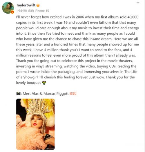 纪录诞生的当晚,泰勒在社交平台发布长文,将镜头拉回2006年的起点:“我永远忘不了首张专辑首周卖出4万张时的雀跃……那时我16岁,无法想象竟有这么多人愿意为我的音乐投入时间与热情。”而19年后,“比当年多百倍的人在这周为我而来”。