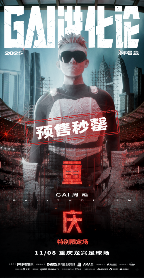 过去一年,GAI的「《GAI进化论》世界巡回演唱会」从重庆出发,十站万人体育馆场场爆满,收获超高口碑,2025年11月8日再次回归重庆!《GAI进化论》体育场特别限定场9月26日在大麦、猫眼、携程预售秒罄创纪录,歌迷翘首以待二开。GAI即将创造新的历史,成为举办体育场级别说唱演唱会第一人,GAI的“年度说唱歌手”实至名归。