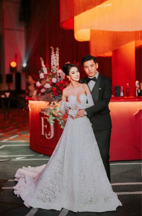 晚宴环节在传统与现代交织中展开。陈铭君当晚换上多套造型,包括Berta、Milan Bridal、Gabriella Vania及Danieleslie等国际设计,由马来西亚高端婚纱品牌Gelly Wee统筹打造;孔令奇则身着The Man Suits定制双排扣礼服及白色晚宴西装亮相.