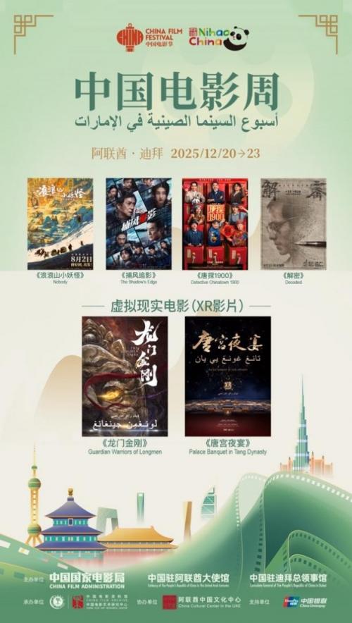 本届“阿联酋中国电影周”以“银幕为桥,连接中阿未来”为主题,将于12月20日至24日在迪拜Dubai Mall的Reel影院进行,旨在以电影为媒介,推动中阿文化交流,增进中阿人民友谊,助力中国优秀电影及文化的海外传播。期间,活动将带来《唐探1900》《解密》《浪浪山小妖怪》《捕风追影》等四部话语力作及《唐宫夜宴》《龙门金刚》等两部虚拟现实电影佳作。