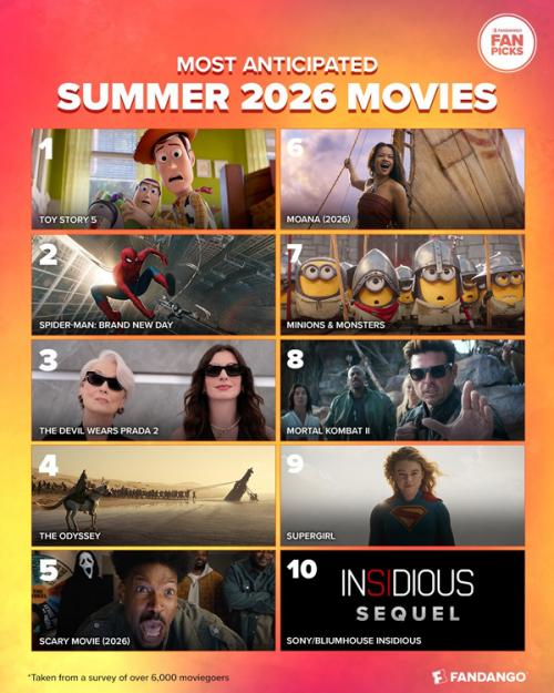 根据对6000多名购票影迷的调查,《玩具总动员5》力压群雄,登顶2026年北美暑期档最受期待影片榜首。排在后面的分别是《蜘蛛侠:崭新之日》《穿普拉达的女王2》《奥德赛》和《惊声尖笑6》。